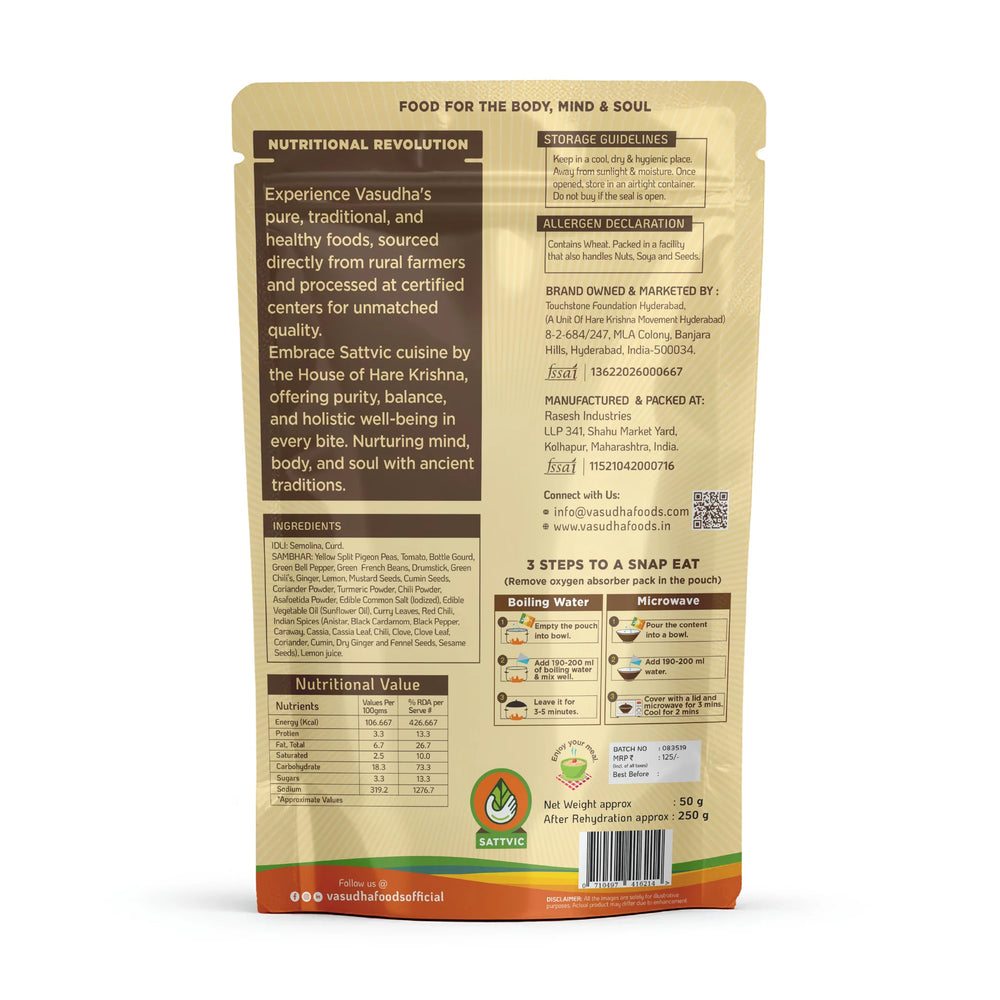 Start your day with the comforting taste of South India – anytime, anywhere! Vasudha Foods Ready to Eat Mini Idli Sambhar is a delicious, sattvic, and wholesome meal that brings the flavors of a traditional Indian breakfast to your plate in just minutes. Made with soft, fluffy mini idlis and aromatic, mildly spiced sambhar, this 100% vegetarian dish is crafted using sattvic principles – free from preservatives, onion, garlic, and artificial additives. Whether you're at home, at work, or on the go, enjoy a nutritious and satisfying meal with zero hassle.
