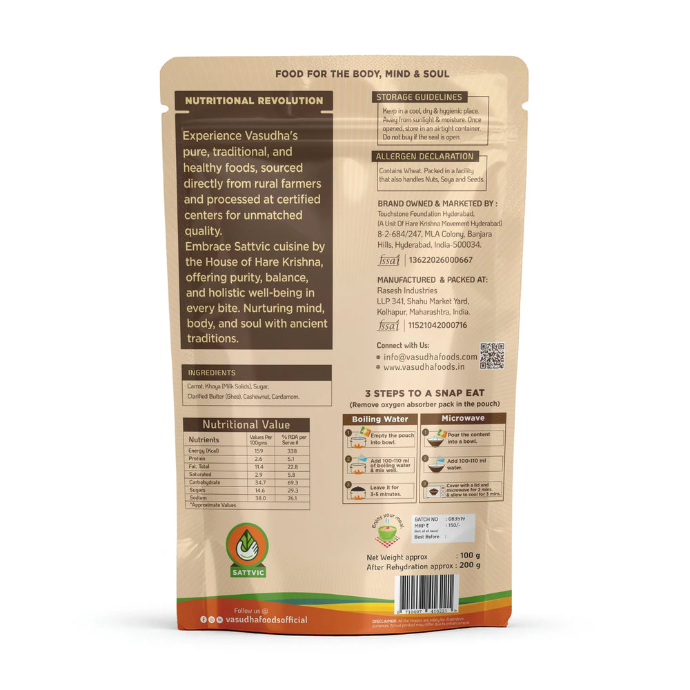Gajar Ka Halwa from Vasudha Foods is a ready to eat Sattvic dessert that brings the sacred essence of traditional sweetness to your table. Prepared in a mindful way and inspired by the House of Hare Krishna, this tasty delight offers a balanced, homely flavor that feels warm, comforting, and truly special in every bite.