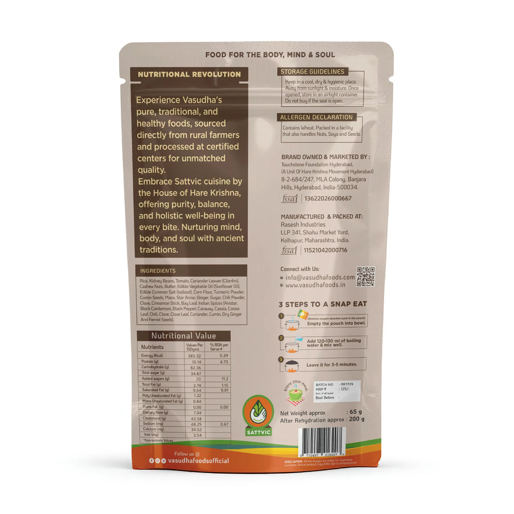 Rajma Chawal from Vasudha Foods is a ready to eat Sattvic meal prepared with a sacred touch and mindful intention. Rooted in the traditions of the House of Hare Krishna, this tasty dish brings together balanced, homely flavors for a deeply comforting experience.